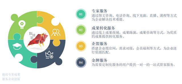 3、成果转化服务,通过线上成果商城、成果路演、成果咨询等方式,为优质的成果提供转化服务。